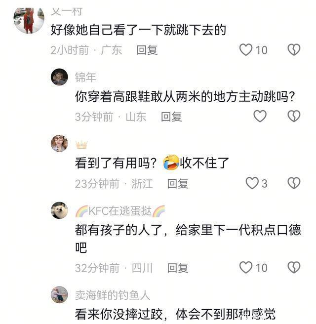 有网友提出质疑,“她好像是看了一眼,然后跳下去。” 其实根本不是那么回事,当时张靓颖穿着高跟鞋,表面上看有跳下的动作,实际上已经无法自控了,而不是有意跳下去的,如同网友所说,那是收不住了。