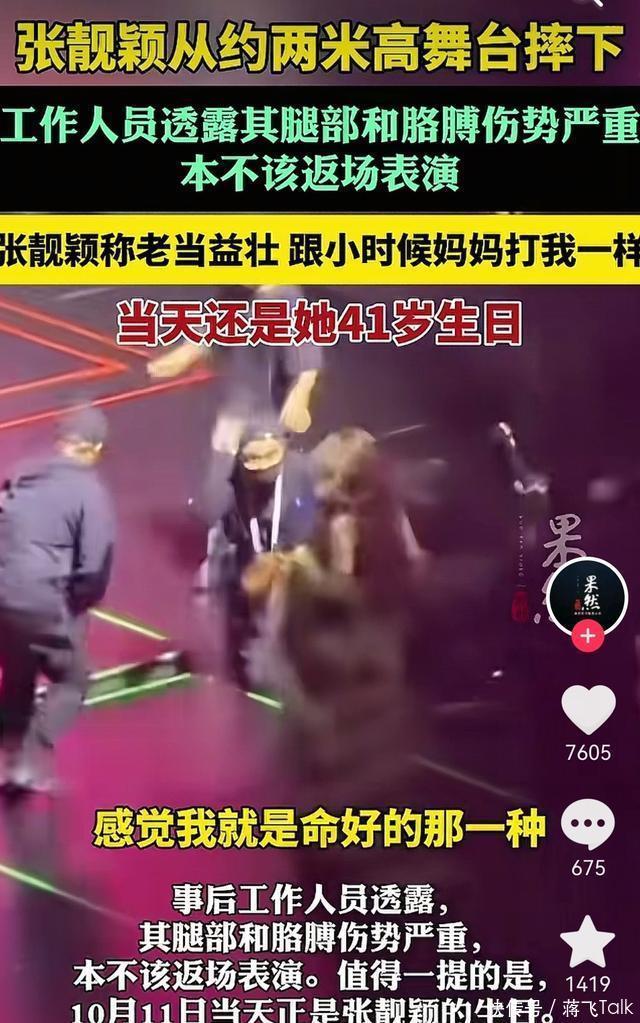 值得注意的是,当天是她41岁的生日,张靓颖感慨的说道“感觉我就是命好的那一种。” 事后粉丝们无比担心,毕竟从那么高的地方摔下去,是很危险的,但是她若无其事的坚持表演,又让人们觉得应该并无大碍! 不过如今有工作人员透露,张靓颖腿部和胳膊都摔伤了,伤势严重,他本不应该返场表演的。