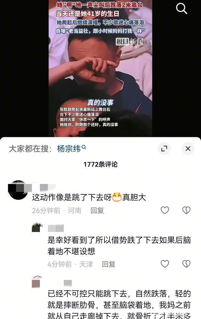 更有甚者,居然表示“咋没摔死” 对于网友的质疑,我想说的是,张靓颖本身就是一个知名度很高的歌手,并且唱功了得,完全没有必要,冒着生命危险去炒作,这种想法不仅对她的敬业是一种侮辱,更是对所有现场为她揪心的观众的不尊重。 对于有些极端的言论,更令人深感失望,是很残忍的人身攻击,无视一个人在工作中遭遇意外时的痛苦和危险,没有共情之心。 用恶毒的话语评判,这种言论也充分的暴露出了其内心的阴暗、冷漠和对他人生命的漠视!